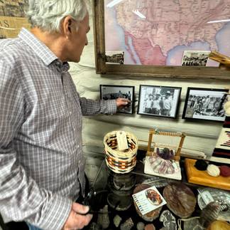 Today his son Scott Yellowhorse runs the shop. It’s closing time, and he takes a break from working underneath the hood of his truck to show us around. The trading post is filled with curiosities of all kinds; one can purchase the same array of refrigerator magnets and metal 66 shield cutouts as elsewhere, but there’s more to interest me: faded photographs of visitors past, a large assortment of secondhand books, bins of tumbled stones, well-made clothing and jewelry. A bit of cash changes hands. I ask Yellowhorse about the bison.